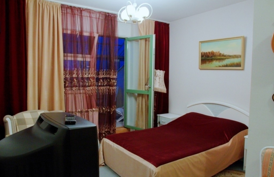 В номере: две односпальные кровати, стулья, кухонная мебель, телевизор, холодильник, электрочайник, набор посуды.