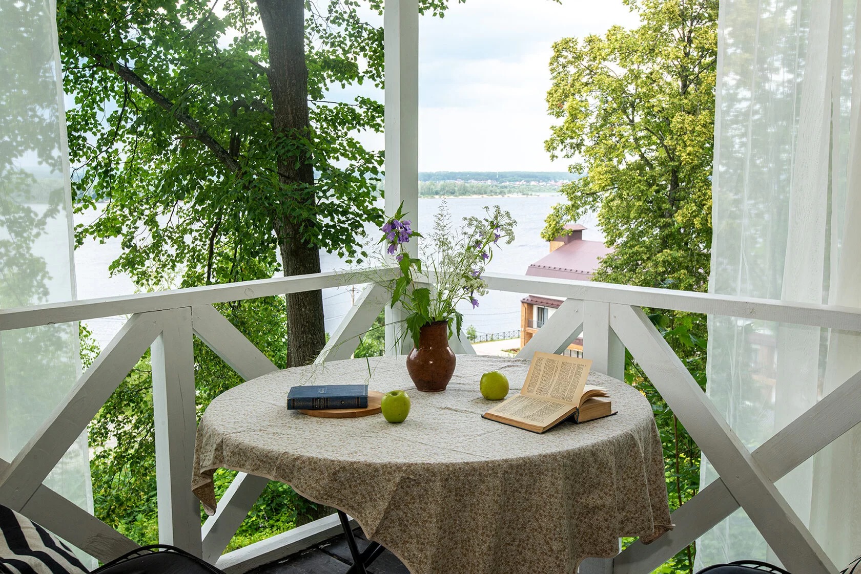 Комфортабельная оборудованная беседка на горе с видом на Волгу.